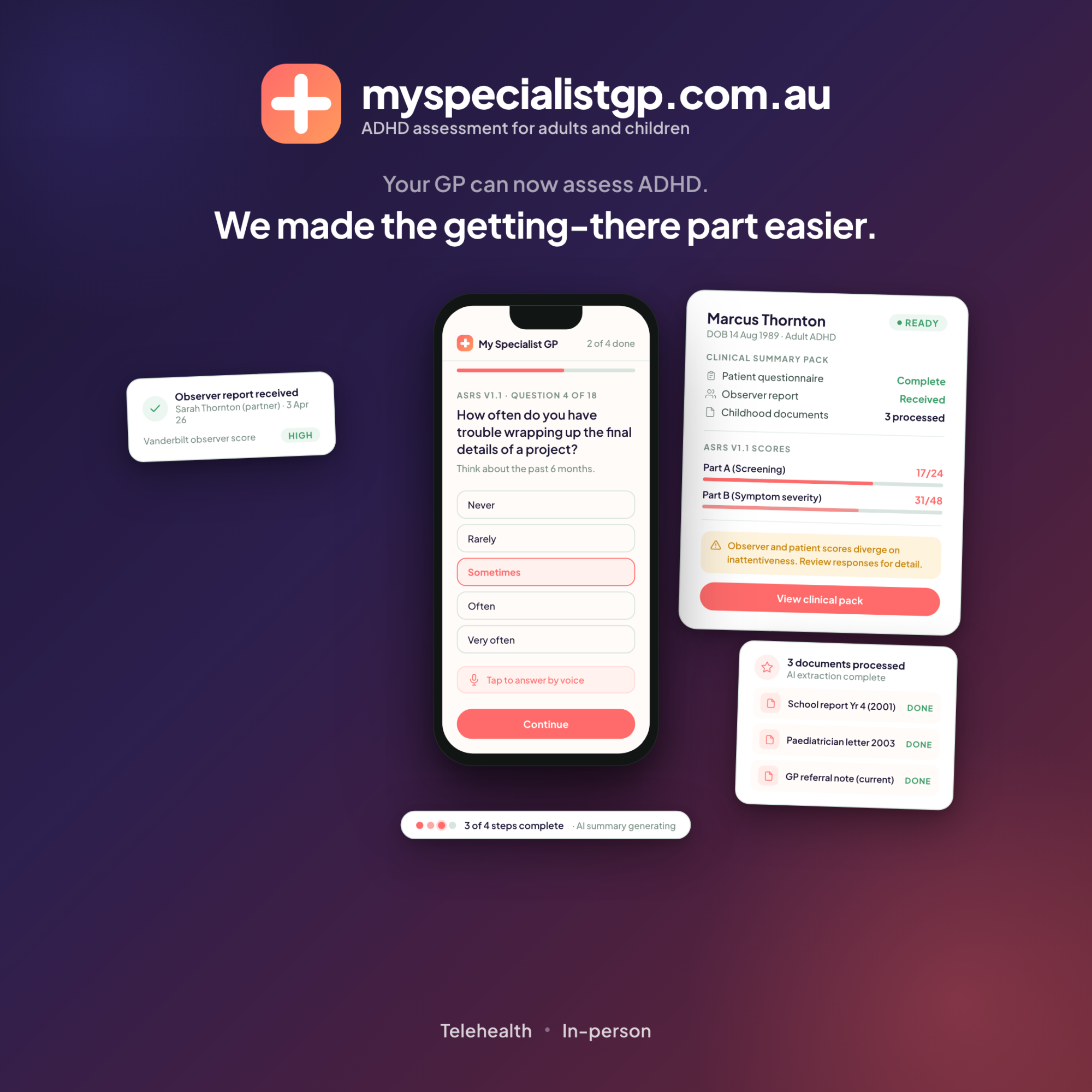 My Specialist GP provides GP-led adult and children/teenager ADHD assessments in person and via telehealth to patients in Australia. In-person appointments are also available in Agnes Water, QLD.No GP referral is required. Before your appointment, you complete a structured intake from home covering symptom history, daily functioning, childhood development, and an observer report from someone who knows you well. This means your GP has the clinical picture before you walk in.Assessments follow current Australian guidelines. Medicare rebates apply to eligible consultations. After diagnosis, ongoing medication management and follow-up care are available through the practice.